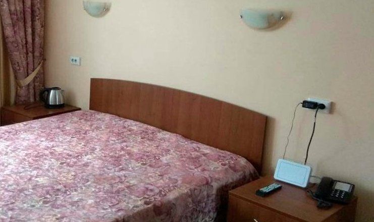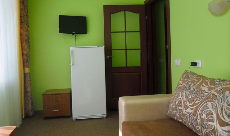 В номере: кровать двуспальная, прикроватные тумбочки, шкаф, мягкая мебель, телевизор, холодильник, чайный набор посуды